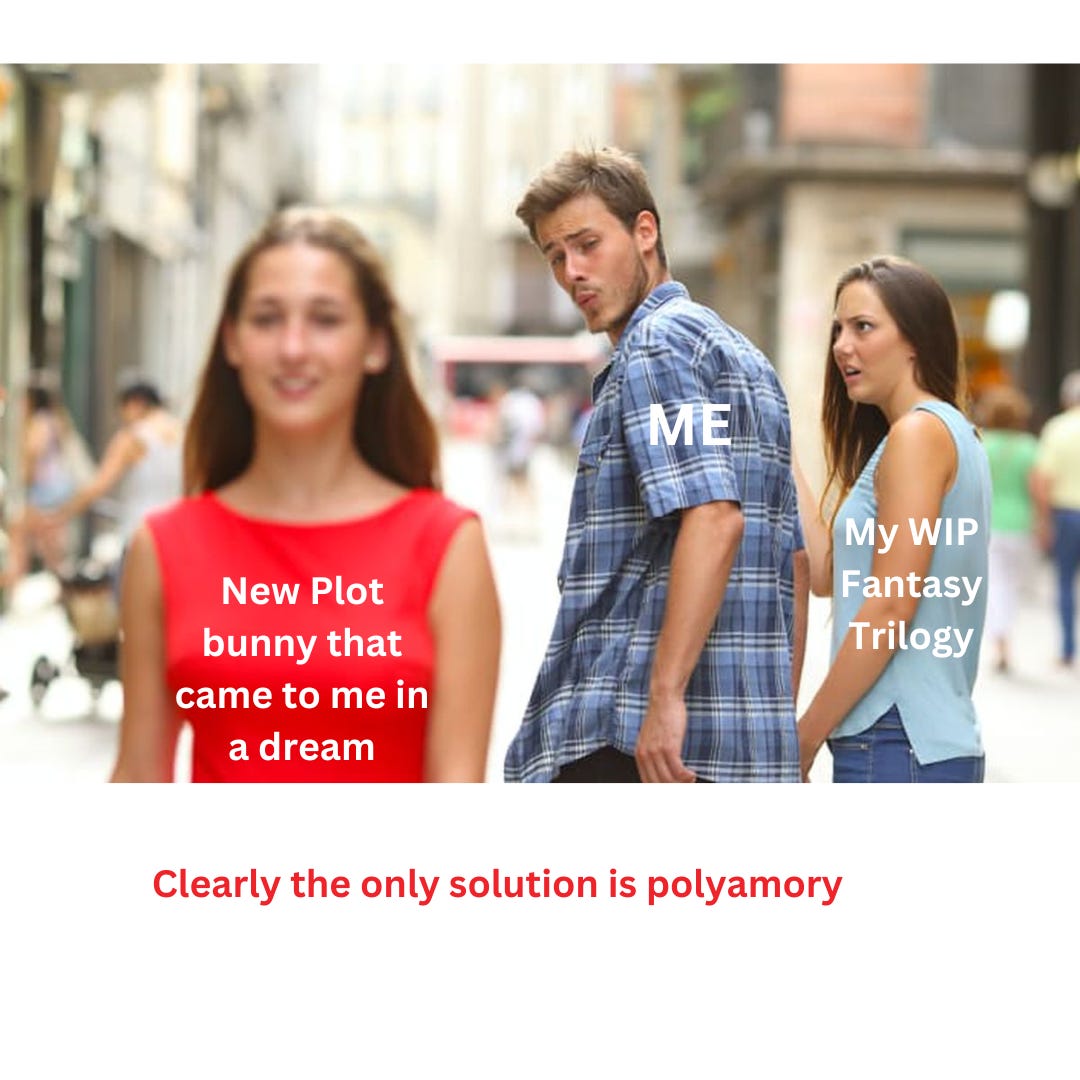 I’ve been extra-productive lately, knowing that my leave is about to end. Every writer knows the feeling of having a gazillion unfinished writing projects. Many have posted some version of the meme below, and this one is mine:.