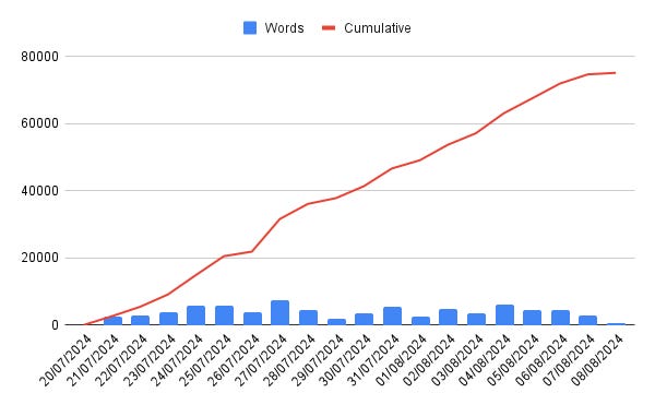 In the vein of avoiding A OR B choices, I decided to have a bit of a fling with the new story, to see if it would allow me to return to the fantasy with fresh eyes. But it would be a timed affair. I would get the first draft done and then go back to the fantasy. Thus began my attempt to see how long it actually took me to write a first draft. Answer: 19 days, 75,000 words. Average: 3000 words / day (roughly 2 hours).
