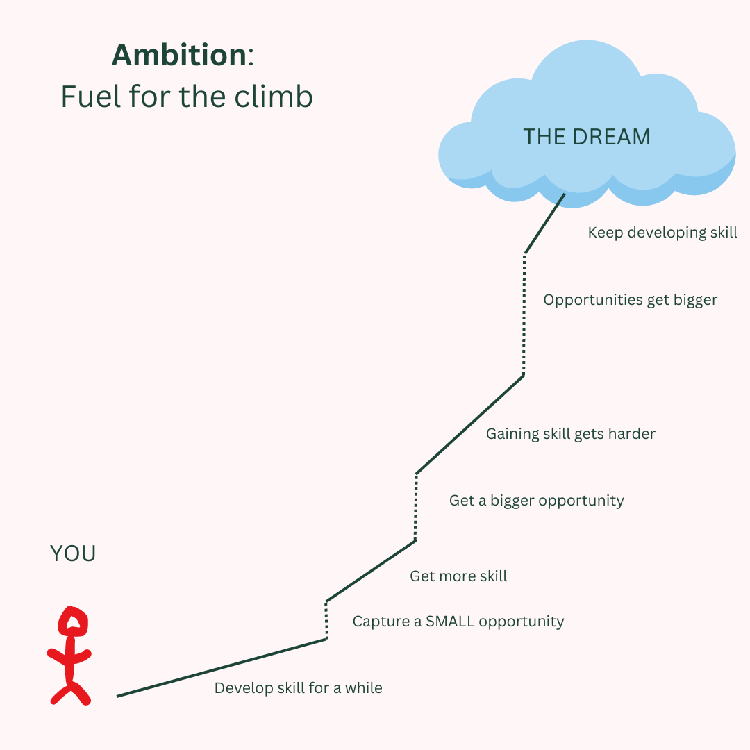 Ultimately, ambition is the fuel that drives you toward your dream. You have to work as hard as you can to develop the skills necessary, and you have to jump at the small opportunities that come your way. Those can lift you higher, but then you have to up your game significantly before getting bigger opportunities. This continues all the way to your ethereal, amorphous dream. I made an infographic with my INCREDIBLE DRAWING SKILLS (people who know me well know that I can’t draw a straight line even with a ruler).