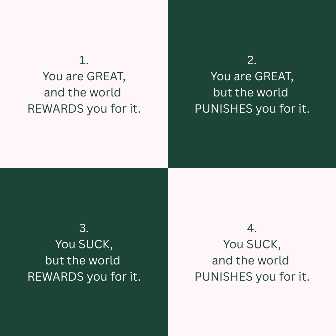 What keeps us from breaking out of Box 4? The simple answer: shame. We’d be ashamed to be in Box 3, to be hyped up and rewarded when we don’t think we deserve it. There’s no joy in being gifted a victory we didn’t earn. And let’s face it, we’ve all encountered arrogant assholes who think they’re so much smarter or better than we are, without the skills to back up their diva attitude.