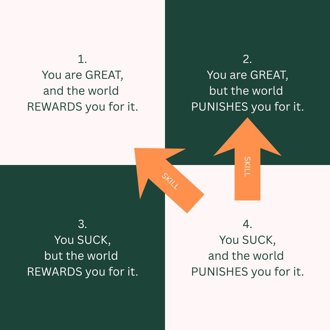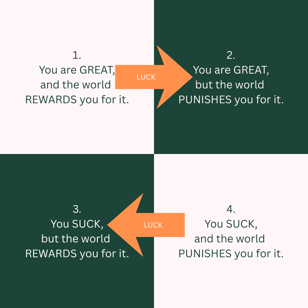 When someone without the skills ends up reaping the rewards, we call that good luck. When someone who has the skills doesn’t get the rewards, we call that bad luck. Both types of luck take us to a dark green box, which makes us very uncomfortable with the universe. We’d rather stay in Box 4 and shit on ourselves than grant luck so much control.