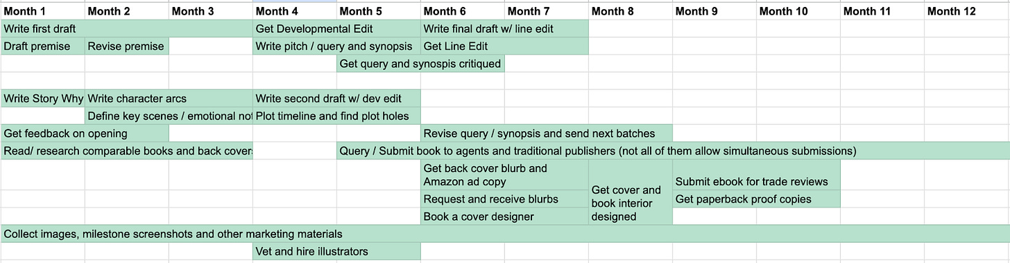 For instance, here’s a draft of a process that could get me a book a year via self-publishing, but provides no guarantees on traditional publishing timelines, which can be 2 years after a book is accepted.